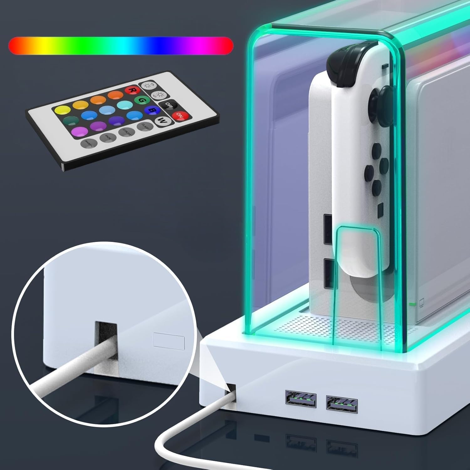 Dock für die Spielekonsole mit RGB-Beleuchtungssteuerung, USB-Anschlüssen und einer farbenfrohen Fernbedienung mit mehreren Lichtmusteroptionen.
